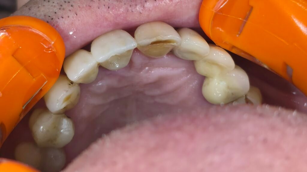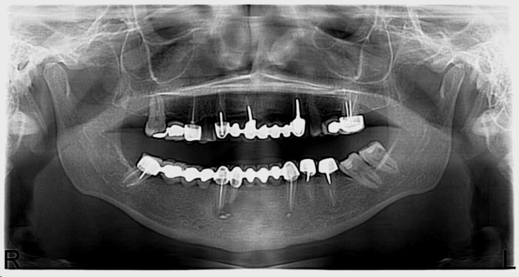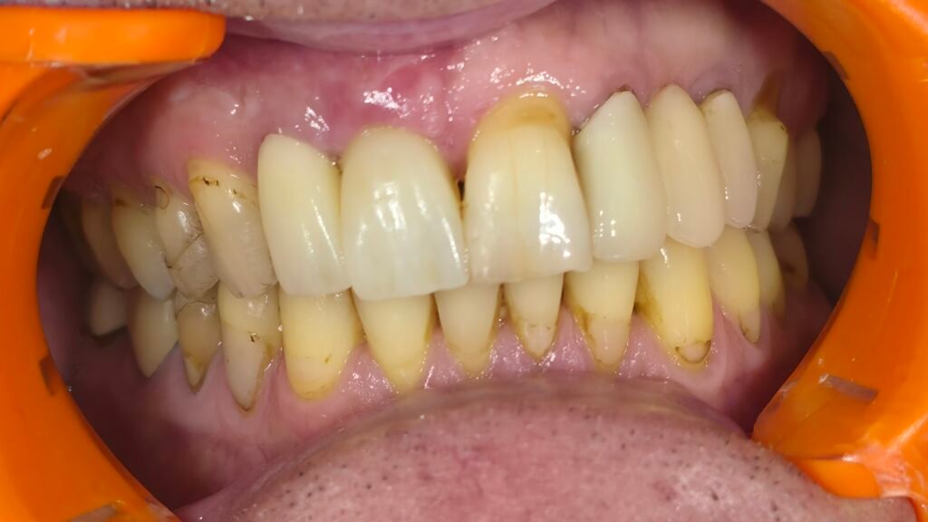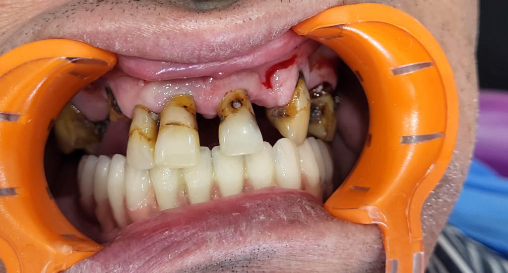 Le patient se présente avec des dents qui bougent, en haut et en bas.